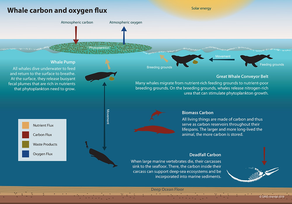 The reason whales were hunted is precisely the reason they are so valuable now: Carbon-dense whale oil was a useful fuel. If whales were allowed to return to their pre-whaling number of 4 to 5 million from a slight 1.3 million today, it could add significantly to the number of phytoplankton in the oceans and to the carbon captured each year. Even a slight increase of 1% of phytoplankton productivity due to whale activity, would capture hundreds of millions of additional tonnes of CO2 per year, the equivalent to the sudden appearance of 2 billion trees.